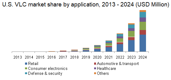 Increasing applications of indoor location-based services embedded with light fixtures in retail shops and hotels is projected to be one of the factors driving revenue growth. Several companies such as GE Lightings, ByteLight Inc. including Koninklijk Philips N.V. are deploying VLC installations in supermarkets which in turn is aiding retailers to tie customers’ shopping history by tracking their location details. This is helping the retailers to deliver on-site information tailored to a customer needs.
