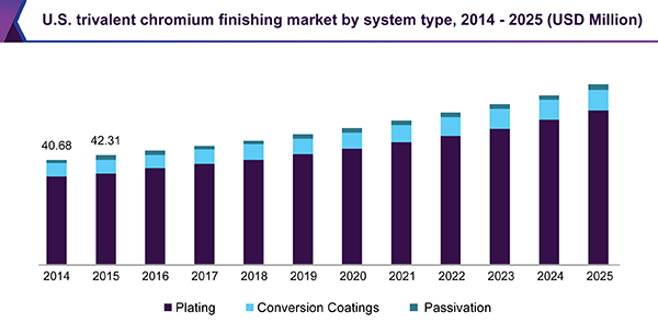 The U.S. trivalent chromium market, in terms of revenue, was valued at USD 44.07 million in 2016 and is estimated to reach USD 69.25 million by 2025. The automobile industry in the U.S. is projected to witness substantial growth over the next 8 years owing to the increasing demand for energy.