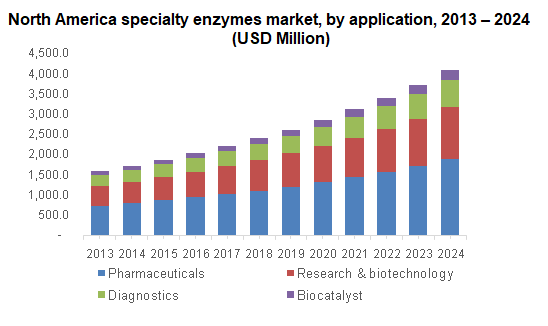 North America enzymes market was valued at USD 3.59 billion in 2015 and will show high gains in light of favorable government policies along with a robust manufacturing base in the U.S. Growing demand for animal feed and biofuels in the U.S. is expected to drive market size.