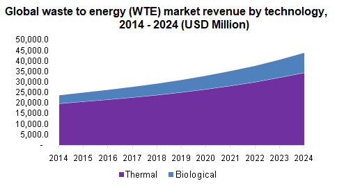 The global waste to energy (WTE) market is expected to reach USD 43.96 billion by 2024, according to a new report by Grand View Research, Inc. Stringent waste management regulations particularly in Europe and in the U.S. coupled with the rise in concern to improve the waste management systems is expected to remain a key driving factor for global waste to energy market. The shift in focus towards energy generation through alternative routes is also expected to shape the industry structure.
