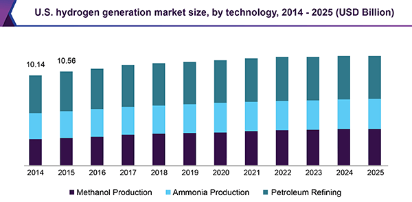 The U.S. hydrogen generation market revenue is projected to expand at a substantial CAGR over the forecast period. Favorable government regulations, coupled with financial and economic benefits offered for adopting renewable sources of energy, are expected to boost industry growth by 2025