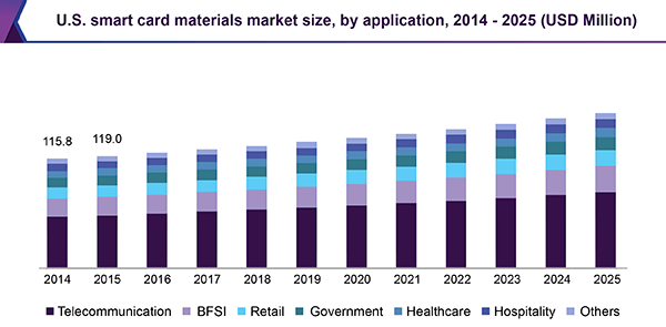 The global smart card materials market size is expected to reach USD 1.29 billion by 2025, according to a new report by Grand View Research, Inc., progressing at a CAGR of 3.7% during the forecast period. Increasing demand for secure and reliable payment transactions is one of the primary growth stimulants for the market. In addition, cost saving schemes for merchants of payment brands and growing inclinations towards cashless payments are further stimulating the growth of the market.