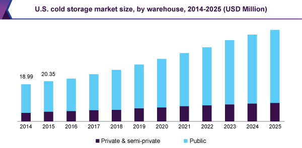 3 Jun 2019 California; The North America cold storage market size is estimated to reach USD 68.23 billion by 2025,according to the new report by Grand View Research, Inc., expanding at a CAGR of 9.9% during the forecast period. Technological advancements in cold storage warehouses are stimulating the growth of the market. Increasing automation is changing the conventional warehouse operations, enabling companies to maximize their output. Growing penetration of robotics applications, automated material handling equipment, and high-speed conveyor systems help in achieving the order accuracy.