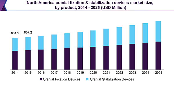 The global cranial fixation & stabilization devices market size is expected to reach USD 2.6 billion by 2025, according to a new report by Grand View Research, Inc., expanding at a CAGR of 5.6% during the forecast period. Increasing prevalence of neurological disorders and road accidents is expected to drive the demand for cranial surgeries and thereby, fixation & stabilization devices over the forecast period.