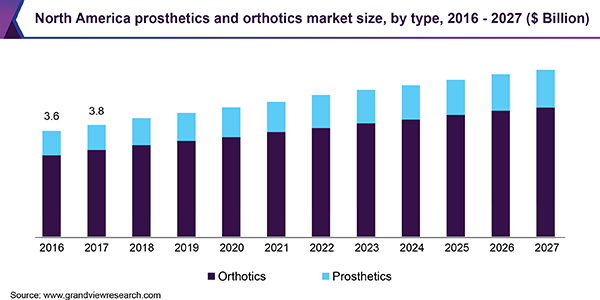 The global prosthetics and orthotics market size is expected to reach USD 13.3 billion by 2027, according to a new report by Grand View Research, Inc., registering a 4.6% CAGR over the forecast period. Increasing incidences of sports injuries, rising incidence of osteosarcoma, and expanding geriatric population base are key factors driving the market.