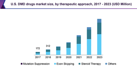 - Exon-skipping platform dominated the therapeutic approaches in 2017, capturing nearly 40.0% of the market. Exondys51 is estimated to be the leading drug for DMD by 2023