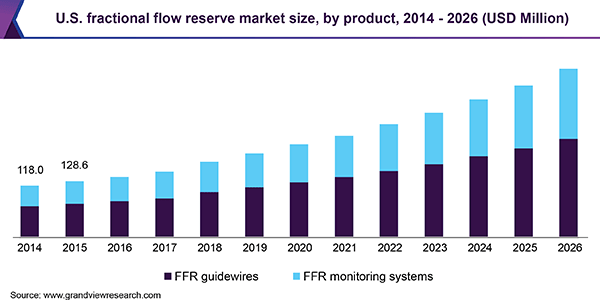 The global fractional flow reserve market size is expected to reach USD 1.20 billion by 2026, according to a new report by Grand View Research, Inc. expanding at a CAGR of 10.4% over the forecast period. widening base of cardiovascular diseases coupled with mounting cases of diabetes in developed as well as developing economies is escalating the growth of the market. Furthermore, launch of novel devices in fractional flow reserve (FFR) market such as guidewires and monitoring systems are also anticipated to aid market growth. For instance, in May 2019, Philips launched IntraSight interventional applications platform. This platform offers comprehensive unit of IVUS, FFR, IFR and co-registration modalities to speed up the routine procedures and simplify complex interventions.