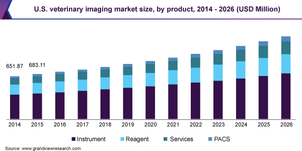 The global veterinary Imaging market size is expected to reach USD 3.3 billion by 2026, according to a new report by Grand View Research, Inc.expanding at a CAGR of 6.8% over the forecast period.The veterinary medicine field experienced immense technological developments in the last 20 years. Various technologies of human medical practice are being adopted for diagnosis and treatment of animals. Advancements in technologies are expected to fuel growth. For instance, launch of portable imaging equipment with battery charge is propelling the adoption of these systems in the following years.