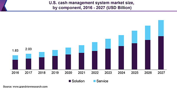 The global cash management system market size is expected to reach USD 25.37 billion by 2027, registering a CAGR of 12.6% from 2020 to 2027, according to a new report published by Grand View Research, Inc. The growth can be attributed to the increasing adoption of cash management systems by organizations to accurately predict their flow of money. These systems help businesses prevent and mitigate any fraudulent activity using fraud prevention strategies, which is expected to further fuel the demand.