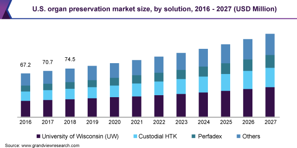 - In terms of revenue, University of Wisconsin (UW) organ preservation solutions segment held the largest market share in 2019 owing to the increasing usage of this solution. The wide applicability and several advantages associated with this organ preservation solutions are also expected to propel the segment growth.