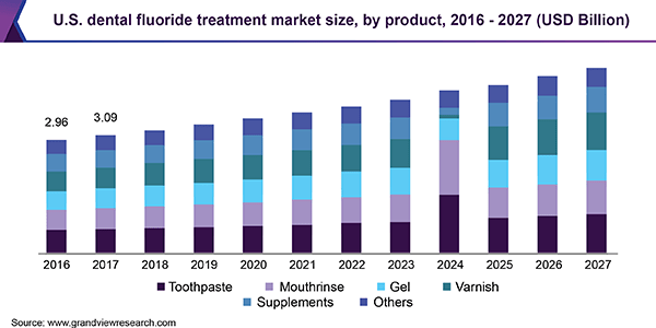 The global dental fluoride treatment market size is expected to reach USD 15.1 billion by 2027, registering a CAGR of 4.3% over the forecast period, according to a new report by Grand View Research, Inc. Key factors driving the market include increasing prevalence of dental caries and rise in awareness about oral health.