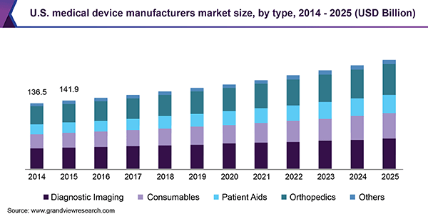 The U.S. medical device manufacturers market size is expected to reach USD 226.7 billion by 2025, according to a new report by Grand View Research, Inc., registering a 5.0% CAGR during the forecast period. Developing countries offer new investment avenues to global market giants, especially the ones in U.S. Developing healthcare infrastructure and increasing disease burden are driving demand for advanced medical devices in these countries.