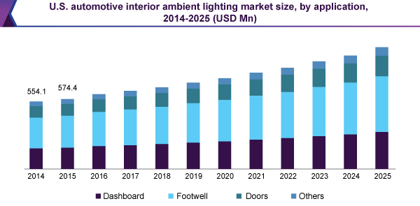 The global automotive interior ambient lighting market size is expected to reach USD 4.59 billion by 2025, according to a study conducted by Grand View Research, Inc., registering a 7.2% CAGR during the forecast period. The adoption of ambient lighting in automobiles is expected to increase due to rising awareness of energy-efficient lighting systems and growing sales of luxury vehicles equipped with navigation and infotainment systems.