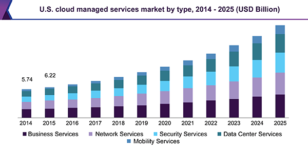 The global cloud managed services market size is expected to reach USD 82.51 billion by 2025, according to a study conducted by Grand View Research, Inc. The focus of enterprises on primary business operations is resulting into higher cloud managed services adoption. Business services, security services, network services, data center services, and mobility services are major categories in cloud managed services market. Implementation of these services will help enterprises to reduce IT and operations costs and will also enhance productivity of those enterprises.