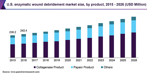 The global enzymatic wound debridement market size is expected to reach USD 1.10 billion by 2026, according to a new report by Grand View Research, Inc., exhibiting a 5.8% CAGR during the forecast period Introduction of technologically advanced products and rise in incidence of chronic diseases are some of the key factors aiding growth.