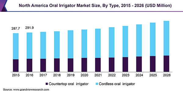 The global oral irrigator market size is expected to reach USD 1.1 billion by 2026, according to a new report by Grand View Research, Inc., registering a 3.4% CAGR during the forecast period. Introduction of technologically advanced dental care products and growing incidence of oral diseases, such as dental caries and periodontitis, are majorly driving the market.
