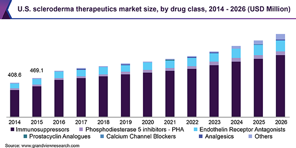 The global scleroderma therapeutics market size is expected to reach over USD 2.6 billion by 2026 registering a CAGR of 6.0%, according to a new study by Grand View Research, Inc. The market growth is credited to the availability of various therapies used off-label, such as small molecule therapies including branded, generics, and OTC drugs.