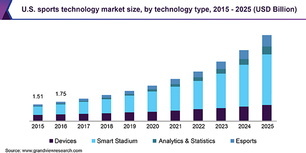The global sports technology market size is expected to reach USD 34.99 billion by 2025, growing at a CAGR of 20.3% over the forecast period, according to a study conducted by Grand View Research, Inc. The growing adoption of IoT technologies, coupled with the integration of social media with stadium technologies, and the need for real-time player statistics are the key factors driving the market growth over the forecast period. Additionally, upcoming international and national sports events and substantial enhancements in spectators engagement are expected to surge the demand for sports technology.