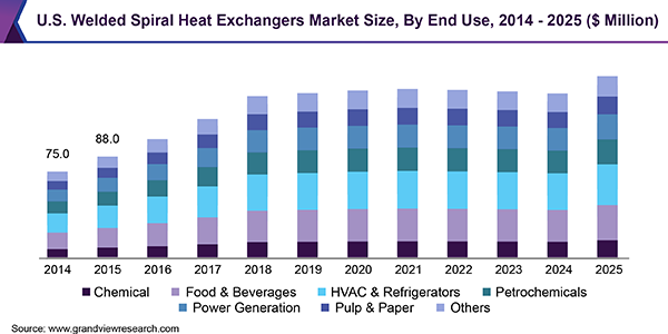The global welded spiral heat exchanger market size is anticipated to reach USD 1.8 billion by 2025, exhibiting a CAGR of 4.0% over the forecast period, according to a new report published by Grand View Research, Inc. The global market is expected to witness significant growth on account of rising product demand from various industries including chemicals, petroleum, and food & beverage, among others.