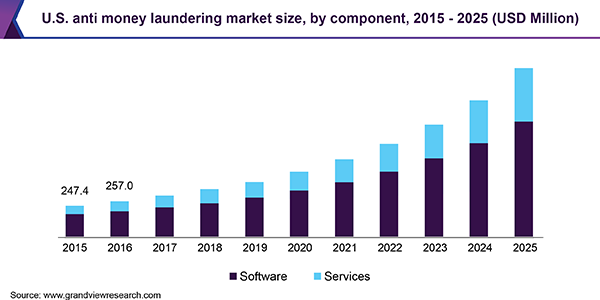 The global anti money laundering market size is expected to reach USD 1.99 billion by 2025, registering a CAGR of 13.6% over the forecast period according to a new report by Grand View Research, Inc. As the detection and prevention of money laundering threats increase with improvements in law enforcement activities, criminals and corrupt individuals are taking substantial care to conceal the sources of their illicit wealth.