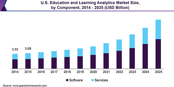 The global education and learning analytics market size is expected to reach USD 49.12 billion by 2025, registering an estimated CAGR of 17.4% from 2019 to 2025 according to a new report by Grand View Research, Inc. eLearning technologies such as student information systems, mobile learning devices, and learning management systems (LMS) have gained prominence over the last few years. These technologies enable the education sector access to huge chunks of data pertaining to learning & teaching practices.