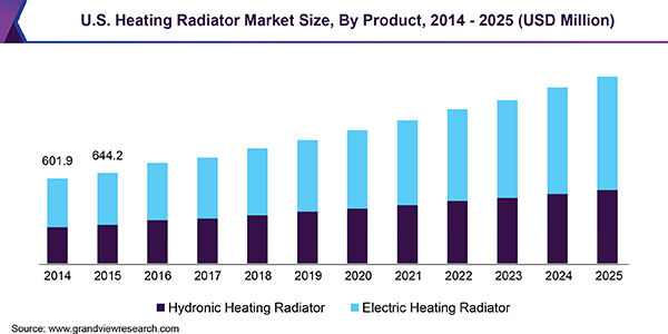 The global heating radiator market size is anticipated to reach USD 9.1 billion by 2025, accelerating at a CAGR of 8.8% over the forecast period, according to a new report published by Grand View Research, Inc. The market is anticipated to be driven by the growing demand for energy-efficient heating solutions in residential and industrial sectors over the forecast period.