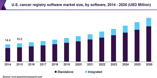 The global cancer registry software market size is expected to reach USD 103.5 million by 2026, according to a new report by Grand View Research, Inc., exhibiting a CAGR of 10.5%. Growing incidence of cancer is expected to aid growth over the forecast period. Currently, cancer is the second leading cause of death globally, and according to WHO, around 70% of the deaths occur in low- and middle-income countries.