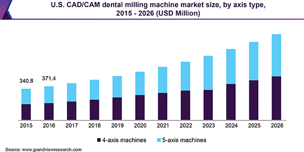 In the U.S., nearly 50% of the total number of dental labs use CAD/CAM, while over 80% of larger labs employ complete CADCAM systems, including milling systems & scanners, among others.Such high adoption of the CAD/CAM software is expected to fuel CAD/CAM dental milling machine market growth. Moreover, advancements in digital dentistry and increasing demand for customized prosthetics & intraoral scanners are likely to contribute to growth.