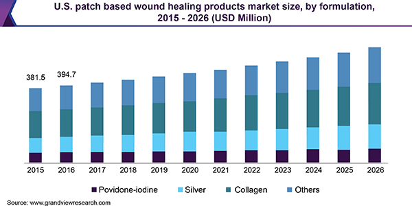 The global patch based wound healing products market size is expected to reach USD 1.51 billion by 2026, according to a new report by Grand View Research, Inc. It is projected to register a CAGR of 4.2% during the forecast period. Factors such as increasing prevalence of acute and chronic wounds, number of surgical procedures, incidence of road accidents, and demand for rapid wound healing products are expected to propel the market growth.