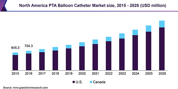The global PTA Balloon Catheter market size is expected to reach USD 5.1 billion by 2026, according to a new report by Grand View Research, Inc., registering a 10.1% CAGR over the forecast period. Expanding geriatric population base, increasing prevalence of cardiovascular diseases,presence of multi-national catheter manufacturers in regions like U.S., Europe, and Japan, and improving medical facilities are some of the key factors propelling the market.