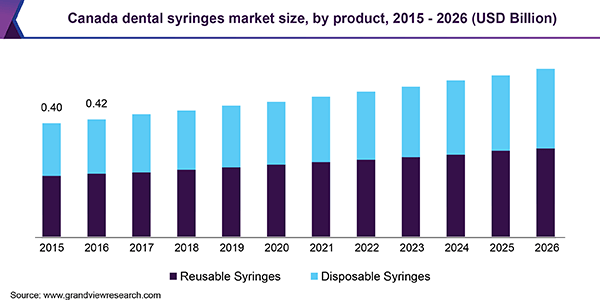 The global dental syringes market size is expected to reach USD 10.85 billion by 2026, registering a CAGR of 4.8% over the forecast period, according to a new report by Grand View Research, Inc. Increasing product innovationsare expected to drive the market growth. In addition, rising prevalence of dental and oral diseases, such as periodontitis, dental caries, and oral cancer is anticipated to fuel the growth.