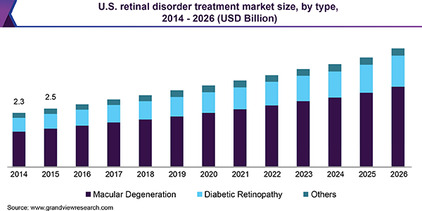 The global retinal disorder treatment market size is expected to reach USD 15.8 billion by 2026, according to a new report by Grand View Research, Inc., registering a CAGR of 7.6% over the forecast period. Increasing prevalence and incidence of retinal disorders is considered to be the primary growth driver.