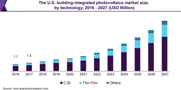 The global building-integrated photovoltaic market size is expected to reach USD 56.2 billion by 2027 registering a CAGR of 23.1% over the forecast period, according to a new report by Grand View Research, Inc. Favorable government policies and guidelines regarding enhanced renewable installations are projected to strengthen the building-integrated photovoltaic (BIPV) market growth over the forecast period.