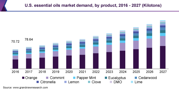 The global essential oils market demand is expected to reach 473.31 kilotons by 2027, according to a new report by Grand View Research, Inc., registering a CAGR of 7.5% from 2020 to 2027. Aromatherapy is rapidly gaining momentum as a convenient method of healing lifestyle diseases, which is contributing to the demand for essential oils. It is also important to notice that sales are closely related to consumer education-the more consumers are informed regarding applications and usage of essential oils, greater is the sales.