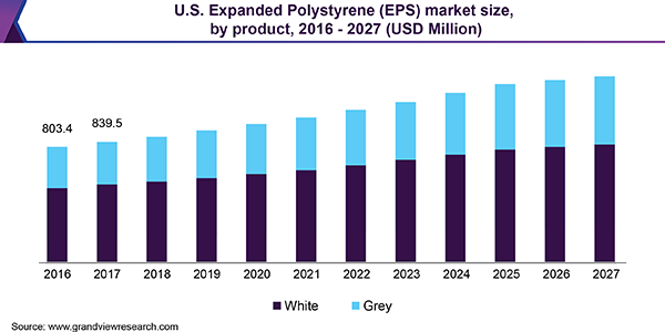 The global expanded polystyrene market size is projected to reach approximately USD 13.66 billion by 2027, according to a new report conducted by Grand View Research, Inc. It is expected to register a revenue-based CAGR of 4.8% during the forecast period. High number of millennials and nuclear families along with increasing disposable income is anticipated to positively impact the consumption of single use expanded polystyrene (EPS) containers provided by food outlets and takeaway stations. These factors are expected to significantly drive the EPS market.