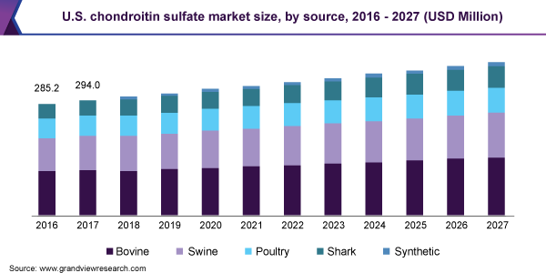 The global chondroitin sulfate market size is anticipated to reach USD 1.5 million by 2027, expanding at a CAGR of 3.2%, according to a new report by Grand View Research, Inc. Growing prevalence of arthritis, thus leading to increasing demand for effective joint health supplements, especially among the geriatric and obese population is anticipated to trigger the product demand in the near future.