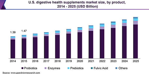 The global digestive health supplements market size is projected to reach USD 15.67 billion by 2025, expanding at a CAGR of 8.8% during the forecast period, according to a new report by Grand View Research, Inc. Rising awareness about the effectiveness of probiotics on immunity coupled with increasing consumer disposable income is expected to fuel the growth. Changing eating habits and increased consumption of high-sodium foods are likely to contribute to the prevalence of gastrointestinal disorders in the developed, as well as emerging economies, which is anticipated to further boost the product sales.