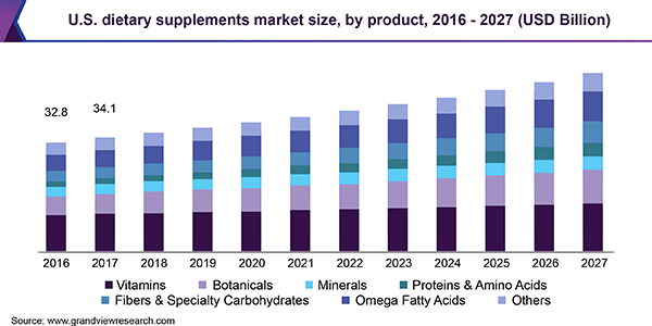 - In terms of dietary supplement product, vitamins emerged as the largest segment in 2019, and is expected to expand at a CAGR of 5.8% in the coming years