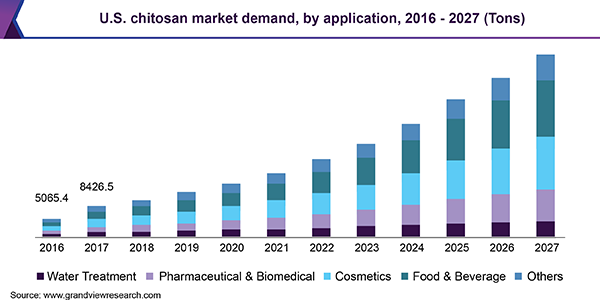 The global chitosan market size is projected to reach USD 28.93 billion by 2027, according to a new report by Grand View Research, Inc. It is expected to expand at a revenue-based CAGR of 24.7% during the forecast period. Increasing consumption of bio-derived products in water treatment, cosmetics, food and beverage, and pharmaceutical industries is likely to derive the growth.
