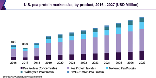 The global pea protein market size is anticipated to reach USD 385.7 million by 2027, according to a new report published by Grand View Research, Inc. It is projected to expand at a 7.6% during the forecast period. Rising consumption of gluten free foods for the treatment of a celiac disease is likely to boost the growth. Substantial prevalence of lactose intolerance among infants and children in developing economies including Central and South America, Asia Pacific, and Middle East and Africa is anticipated to further drive the growth.