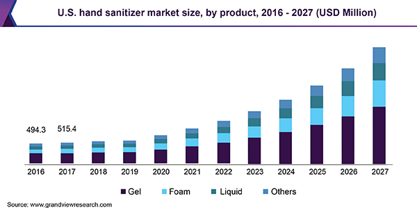 The global hand sanitizer market size is anticipated to reach USD 13.7 billion by 2027, expanding at a CAGR of 22.6%, according to a new report by Grand View Research, Inc. Growing emergence related to regular hand washing and sanitization among consumers owing to recent COVID-19 pandemic have set the tone for the market enhancement during the forecast period.