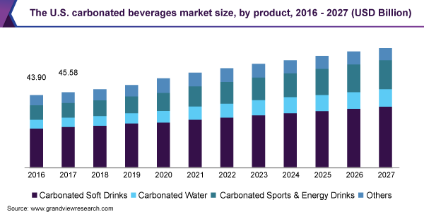 The global carbonated beverages market size is expected to reach USD 607.25 billion by 2027, according to a new report by Grand View Research, Inc., expanding at a CAGR of 5.1% from 2020 to 2027. Growing demand for premium drinks, coupled with improvement in economic indicators in developing economies, is expected to promote market growth. Furthermore, increasing spending by the carbonated beverage manufacturers has been playing a crucial role in the industry movement at the global level. These innovations are being brought in product, packaging, distribution, and other various aspects of the business. In June 2020, PepsiCo took an initiative to expand Soda Stream into an away-from-home environment, including workplace, college, airport, and other professional places with large public interactions.