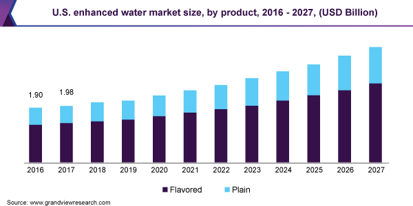 - The plain product category is expected to account for the largest revenue share during the forecast period with a CAGR of 8.6% from 2020 to 2027. These products are the perfect replacement for regular water and have the least possibility of having a certain color or flavor added to them.