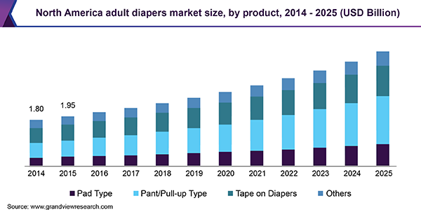 The global adult diaper market size is poised to reach USD 28.65 billion by 2025, progressing at a CAGR of 12.7% from 2019 to 2025, according to a study conducted by Grand View Research, Inc. The market is primarily driven by rising prevalence of urinary incontinence among geriatric populations across the world. This is a widespread global disease resulting from obesity, urinary tract infection, and hysterectomy, among others. Adult diapers offer maximum absorbency and protection for those who suffer from aforementioned conditions. Moreover, extensive urbanization, development of the healthcare sector, and increasing awareness regarding the usage of adult diapers for urinary incontinence are projected to provide an upthrust to the market.