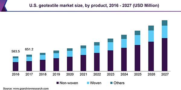 Innovations by manufacturers are backed by government and regulatory bodies to improve product properties, which, in turn, would contribute to the market growth. Governments across various countries are actively participating in geotextile production as it creates ample employment opportunities and helps in the improvement of adverse environmental conditions. Geotextiles are used in soil to improve stability and to protect land surface to promote vegetation growth. The product also plays a significant role in soil erosion control and helps mitigate soil erosion. On-going research related to the use of geotextiles for soil erosion prevention in unpredictable climatic conditions is expected to aid in promoting their application in erosion prevention over the forecast period.