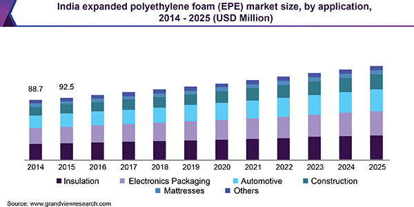 The India expanded polyethylene foam market size is expected to reach USD 140.0 million by 2025, according to a new report by Grand View Research, Inc. It is projected to expand at a CAGR of 4.2% during the forecast period. Growth of the automotive industry results in growth of related industries, such as steel, plastics, and aftermarket services. Automotive market is the largest end user of expanded polyethylene foam and molded products for numerous applications owing to favorable mechanical and chemical properties of EPE foam. Increasing use of thermoplastics in auto components as opposed to glass and metal is expected to drive the market.