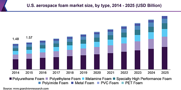 The global aerospace foam market size is expected to reach USD 8.66 billion by 2025, according to a new report by Grand View Research, Inc. It is projected to expand at CAGR of 6.1% over the forecast period. Aerospace is one of the most attractive destinations for polymer foam manufacturers. Strong demand for next-generation commercial aircraft owing to the growing passenger traffic, especially in Asia Pacific and Middle East and Africa, is expected to drive the demand for polymer foam.
