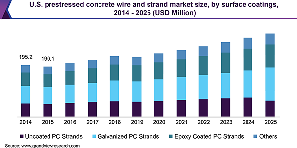 Galvanized coated prestressed concrete (PC) wire and strand led the U.S market. These products provide long-term protection against corrosion caused due to concrete carbonation, salts, and pollutants. Moreover, they are high in demand due to their low life cycle cost, as it helps significantly to reduce the overall cost of project.