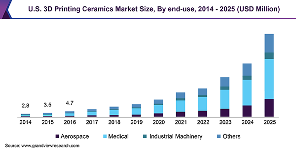 The global 3D printing ceramics market size is expected to reach USD 159.5 million by 2025, accelerating at a CAGR of 34% over the forecast period, according to a new report by Grand View Research, Inc. Advancements in printing technology and increased investments are among drivers triggering the market growth.