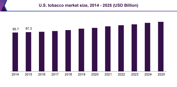 The U.S. tobacco market is expected to reach USD 119.3 billion by 2025, according to a study conducted by Grand View Research, Inc. Increasing consumer disposable income and the availability of superior products such as customized e-cigarettes and pipes have bolstered the market growth.